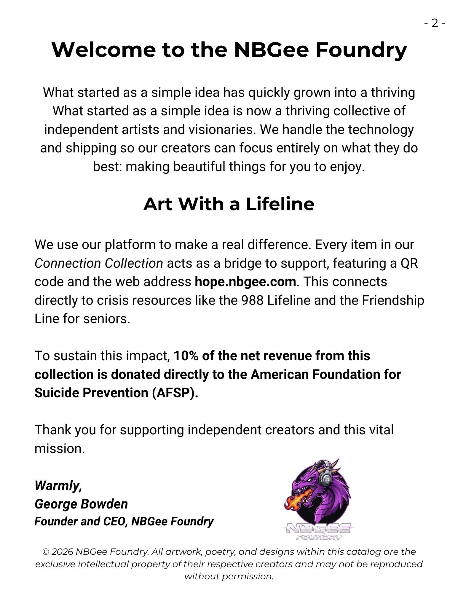 We believe in using our platform to make a real difference. Every physical item in our Connection Collection acts as a bridge to support, featuring a printed QR code and the web address hope.nbgee.com. This connects directly to our dedicated directory of crisis resources, including the 988 Lifeline and the Friendship Line for seniors.