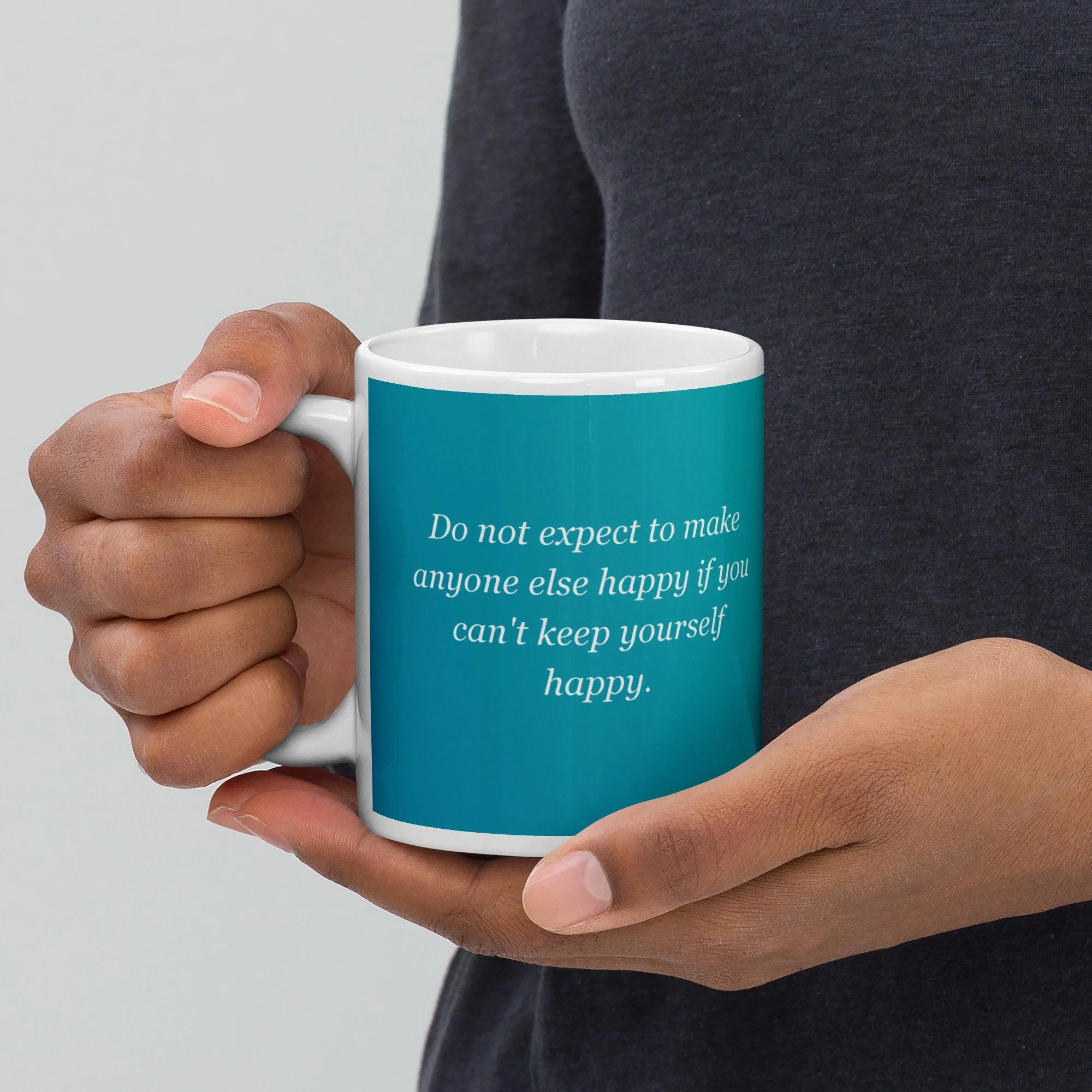 The image presents a minimalist yet powerful design set against a soothing gradient backdrop that transitions from a deeper teal on the left to a brighter, refreshing turquoise on the right, evoking a sense of calm and clarity. Two identical blocks of white, elegant cursive text are centrally displayed, creating a balanced and reflective visual composition with no discernible physical texture, only smooth digital hues. The core message, "Do not expect to make anyone else happy if you can't keep yourself happy," resonates deeply with Trish Ginther's philosophy of self-care and personal responsibility, central to empowering teens to prioritize their own well-being before tending to others, a theme prevalent in her work, especially regarding "thinking things out" and recognizing one's own choices.