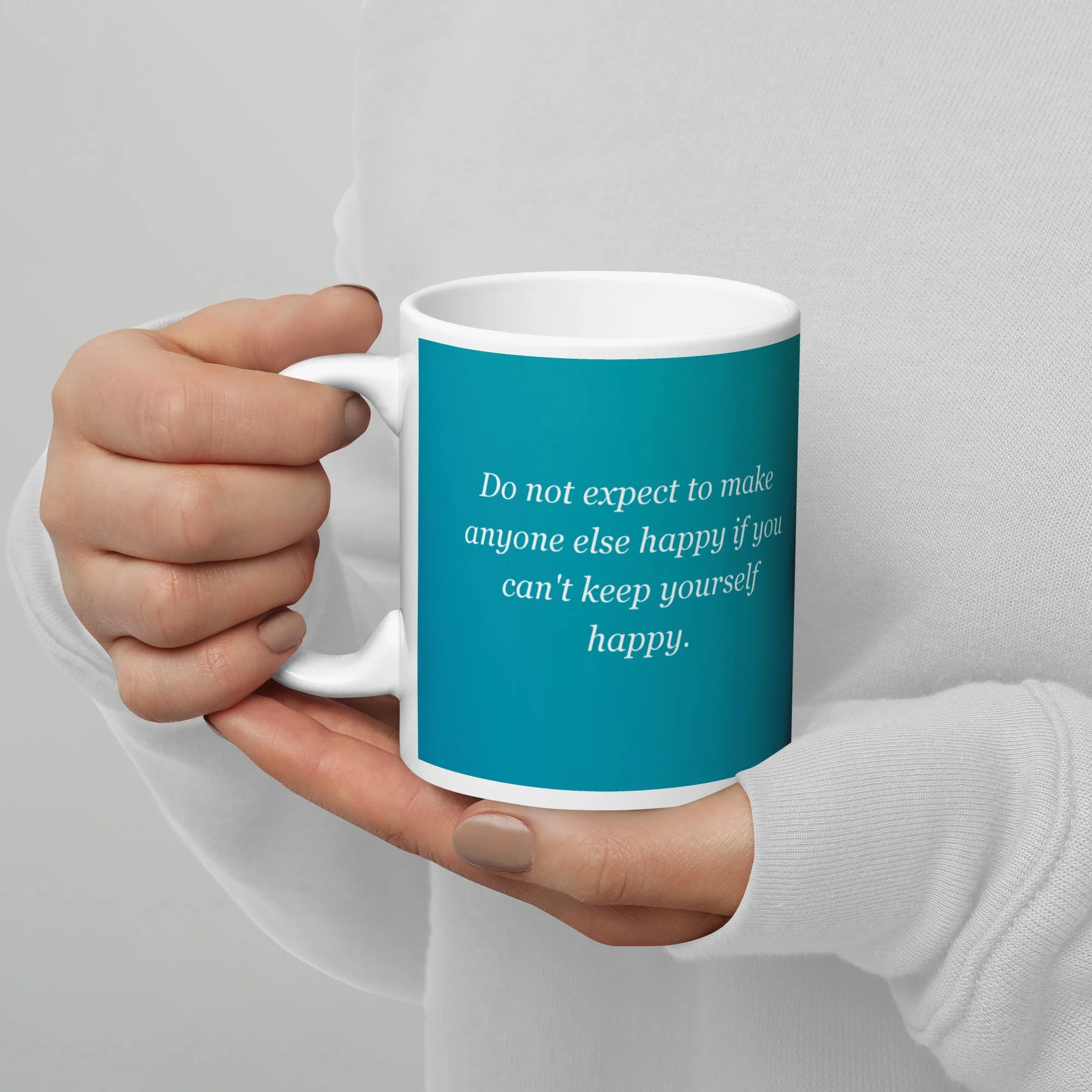 Aesthetic: A serene gradient of teal and turquoise provides a calming backdrop for an empowering, elegantly scripted quote on self-care and personal happiness.
